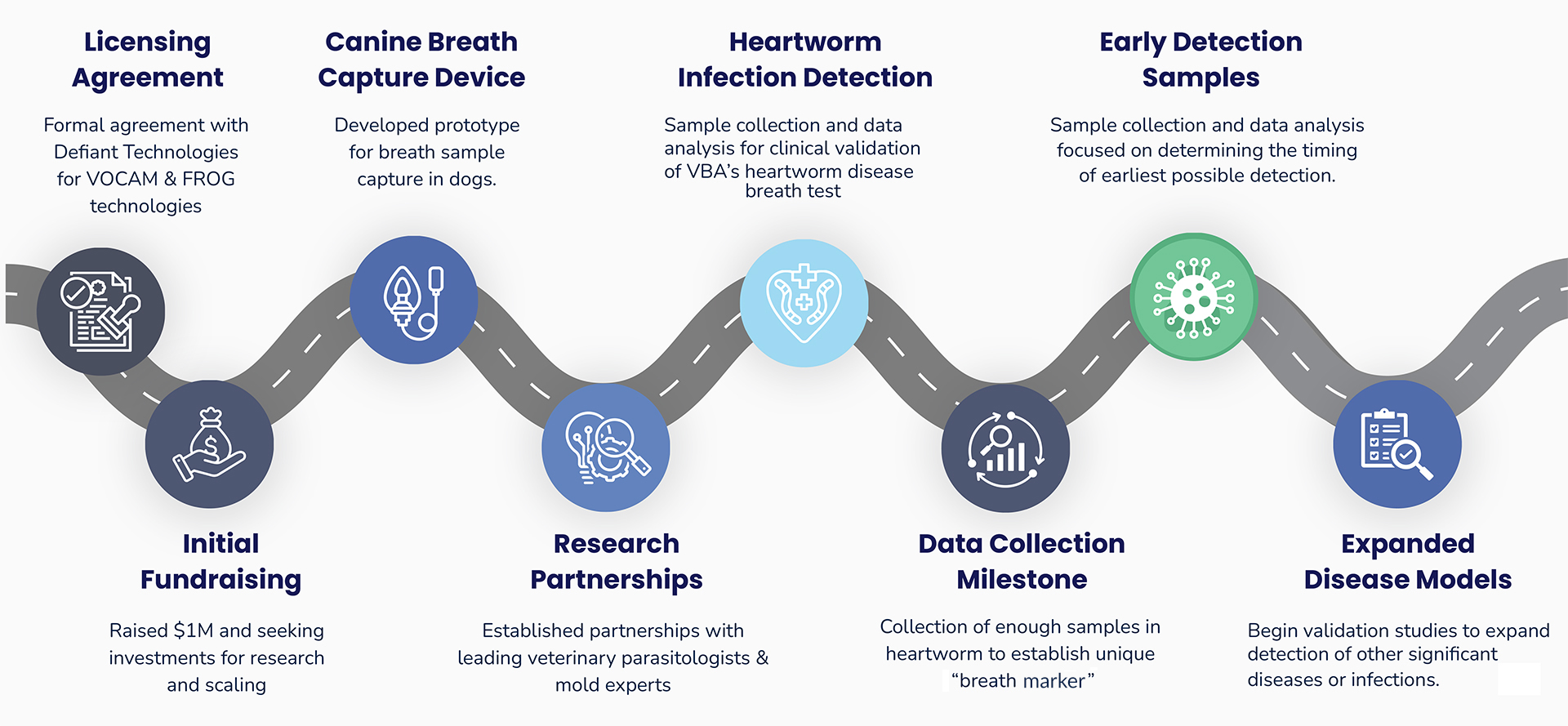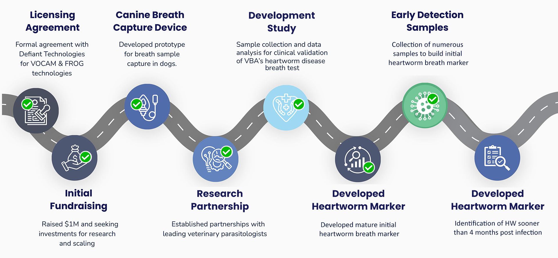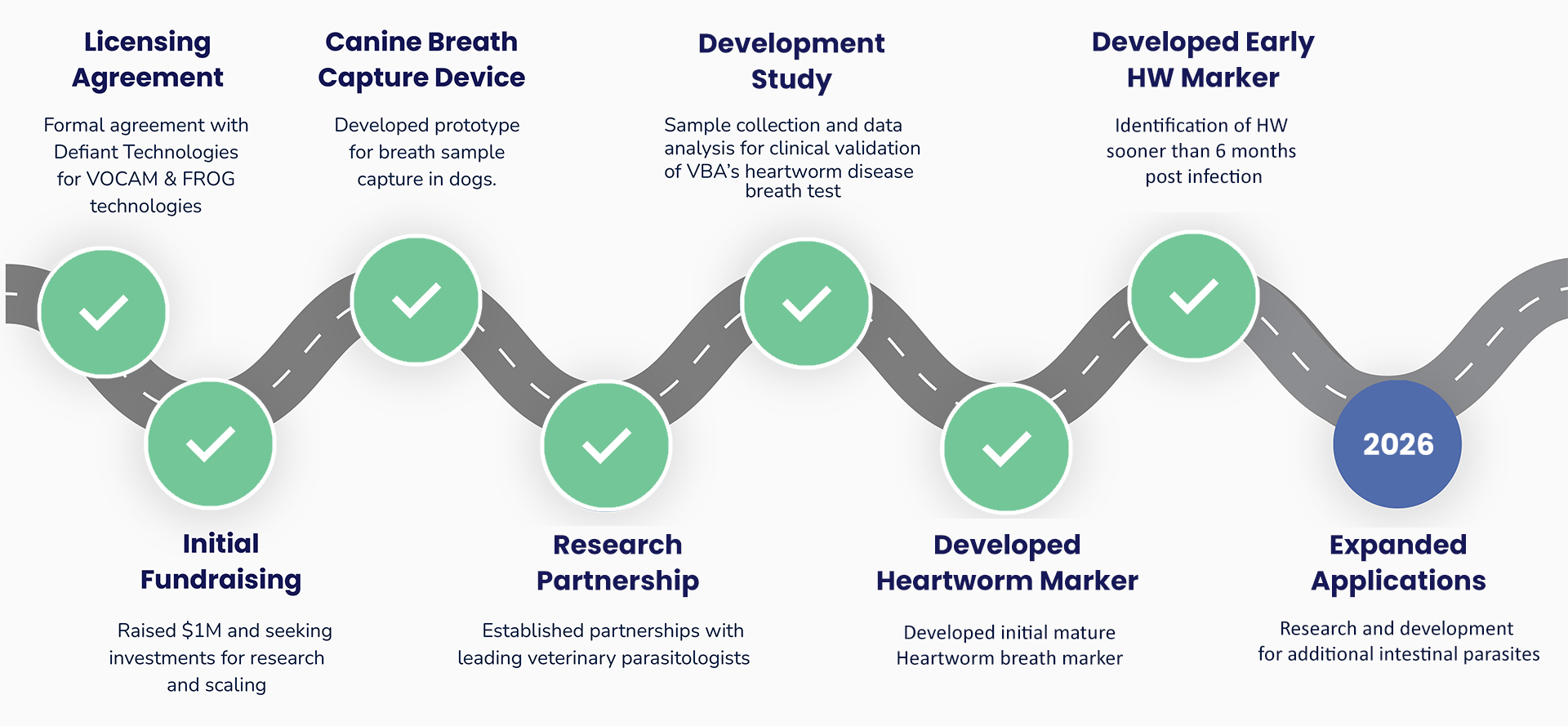 We will strive to create a point-of-care breath test for a myriad of animal diseases starting with heartworm in dogs. The entire panel of diseases can be tested with a single breath sample and provide immediate results. Our AI software will continuously learn to maximize accuracy and improve results.