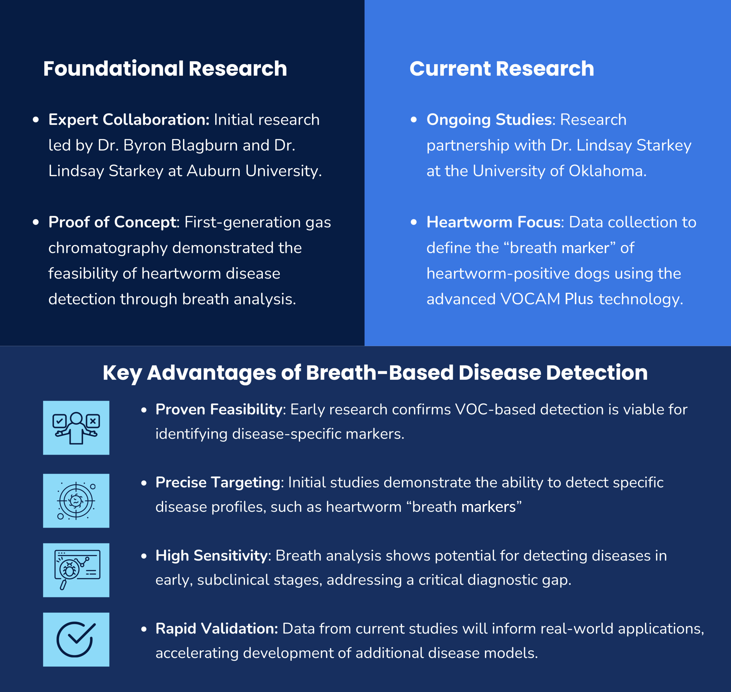 Vet Breath Analytics began its clinical validation with heartworm disease, leveraging breath analysis to detect early-stage infections. This innovative approach has the potential to expand into detecting other diseases such as hookworms, roundworms, whipworms, and tapeworms to name a few.